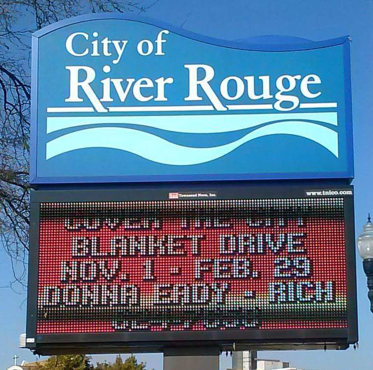 Annual Cover the City Blanket Drive, displayed on the Blurb on the Curb, River Rouge, MI. Thank you Jeanne Hubbard, and RR Library staff.